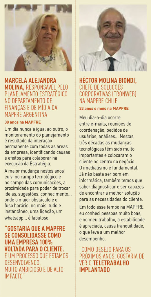 «Também é importante que a empresa continue nos proporcionando novos desafios» acrescenta Marcela, «e inspiração para continuar aprendendo», continua Norah, “porque o componente principal da MAPFRE é suas pessoas, seus empregados, alinhados em sua Missão, Visão e Valores. É definitivamente um Great Place to Work». «Eu tive a sorte de conhecer pessoas maravilhosas», conclui Antonio, «que ao final se tornaram algo mais de mim, como se fossem minha própria família. Me sinto muito orgulhoso das experiências pessoais e profissionais. Eu me considero o que sempre chamamos de Pessoa MAPFRE».
